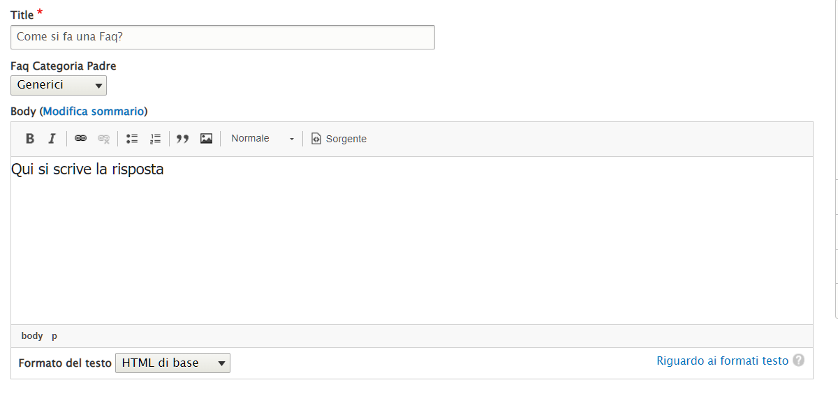 Questo contenuto permette di creare delle Faq, ovvero delle frequently asked questions (Domande frequenti) che verranno pubblicate nella sezione dedicata raggiungibile dal footer (il piè di pagina) del sito, e che potranno essere raccolte per argomento.