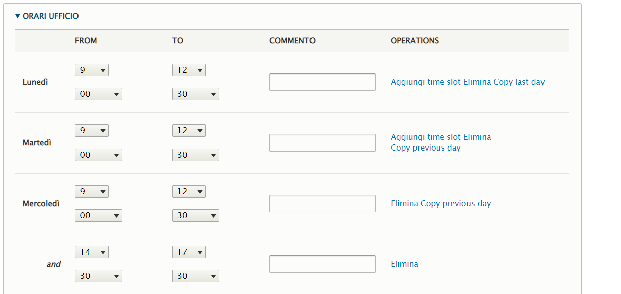 Questa procedura vale per qualsiasi pagina che prevede l'inserimento di orari di apertura.