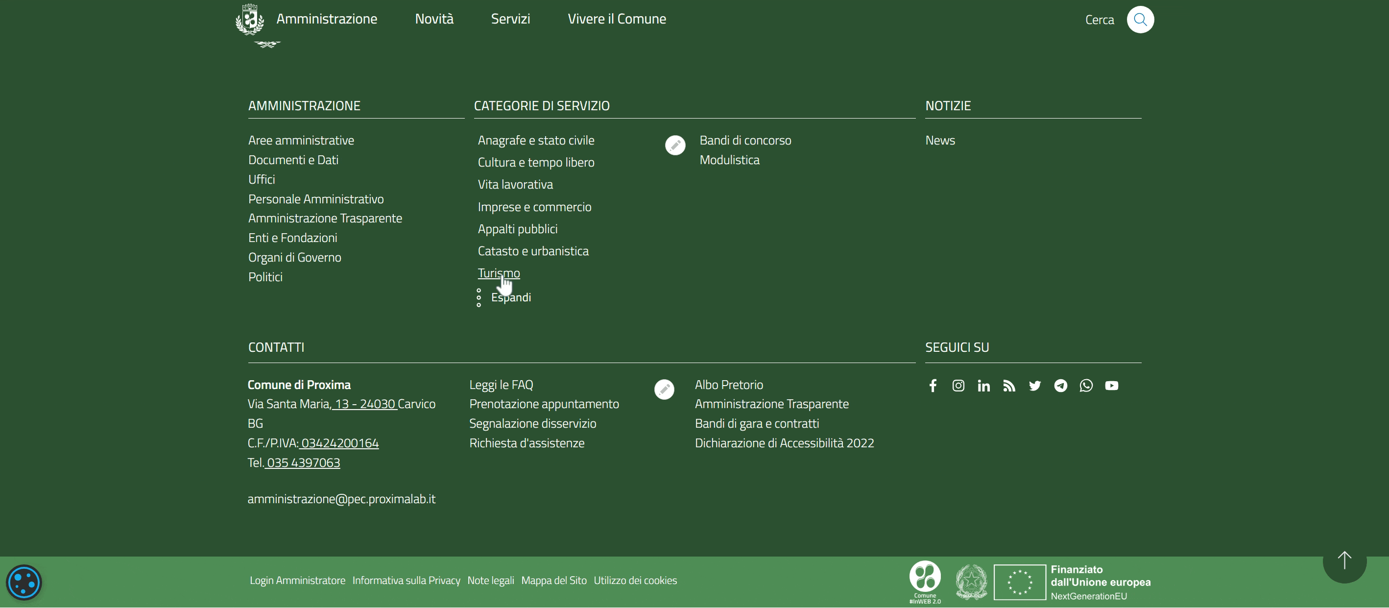 Nella sezione inferiore del sito sono riportati link e dati del Comune. E' possibile modificarli in qualsiasi momento in modo molto semplice.